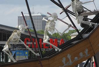 Une grande roue que font tourner les passants au moyen d'un système de câbles. Dans la roue vingt squelettes dans des positions évolutives décomposant un mouvement de rameur. C'est l'histoire de Charon, le nautonnier qui fait passer les âmes à travers le Styx.