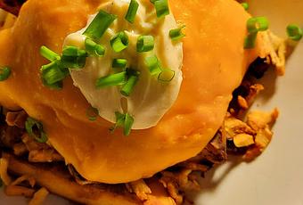 Sur des frites cuites au four (avec huile de canola, un peu de fécule, ail séché, levure alimentaire, sel, poivre, et curcuma)...