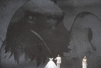 Le mariage doit être annulé. Sémélé, promise à Athamas, veut plus de la vie et s'échappe de la réalité bourgeoise. "C'est une femme qui cherche l'impossible et qui est prisonnière d'un monde dans lequel cette catégorie d'accomplissement n'est pas prévue", explique Claus Guth. Entre les deux scènes du mariage avorté et du mariage accompli la mise en scène nous entraîne par une brèche, ouverte à la hache par Sémélé dans le mur du fond, vers le monde des dieux, en tout antinomique à celui des humains : un monde d'une noirceur innommable et sinistre qui ressemble bien plus aux terrible monde infernal qu'au séjour idyllique d'un panthéon. Mais Sémélé est-elle vraiment entrée dans ce monde sombre et angoissant, où est-ce là la représentation de son parcours dans le monde intérieur de sa folie ?Jupiter, ou le fantasme qu'en a Sémélé, s'annonce par une chute de plumes noires alors que le mariage de Sémélé et d'Athamas va bientôt être prononcé. La chute des plumes sera un thème récurrent de la mise en scène. Au deuxième acte, on verra l'envers du décor. Claus Guth nous montre l'autre côté de la brèche qu'a ménagée Sémélé dans le mur de la salle d'apparat : une paroi noire et touffue faite d'une multitude de guirlandes de plumes noires avec un trou béant en son centre. Réalité mythique ou mirage de la folie, Sémélé fait ses premiers pas dans la terre effrayante des dieux, celle de Jupiter, Junon ou Iris, des êtres tout de noir vêtus, sinistres stratèges qui vont s'emparer de la destinée de la fille de Cadmus. À la blancheur du monde blanc et lumineux du royaume de Cadmus s'oppose la noirceur du monde des dieux.Retour à la salle d'apparat qui a subi sans doute les foudres de Jupiter et dont les murs et le plafond sont troués de cratères aux bords brûlés. Des flots de plumes noires se déversent de ces orifices auxquels sont accrochés des êtres aux ailes noires qui font partie de la cour de Jupiter. Junon son épouse manigance la perte de Sémélé avec l'aide de sa suivante Iris et de Somnus qu'elle réveille pour lui ordonner de la servir dans ses entreprises. De noirs desseins qui conduiront à la perte de Sémélé. Sémélé, qui s'est livrée aux étreintes de son amant sous l'avatar d'un aigle immense, en voudra davantage : excitée par les stratagèmes de Junon, elle aspire à l'immortalité et exige de Jupiter qu'il revête pour elle son apparence réelle, ce qui équivaut à prononcer son arrêt de mort.