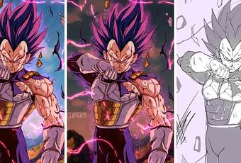 Habillé dans son armure Saiyan habituelle, il est clair que Vegeta a eu du mal dans cette image, car presque tout son côté gauche est déchiré en lambeaux, avec le reste de son corps battu et malmené. Fellipe illustre parfaitement la nature rugueuse et déterminée de Vegeta alors qu’il essuie nonchalamment le sang de son visage et verrouille les yeux avec un ennemi distant se cachant juste hors de l’écran. Dessiné pulsant et crépitant d’énergie violette, le look sans sourcils de Vegeta Super Saiyan 3, ses muscles saillants et sa vascularité intense font le saut des pages noir et blanc du manga à un design anime entièrement réalisé que l’émission doit prendre en compte.