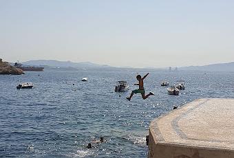 J'ai pris cette photo à Niolon, à une petite demi-heure de Marseille que l'on distingue au loin. On y accède soit en voiture soit en train grâce au TER de la Côte Bleue depuis la gare Saint-Charles. Il est un peu avant midi, il n'y a pas foule. Quelques minots qui battent des bras et des jambes avant de faire plouf, des habitants mêlés aux estivants, un parasol bariolé sur lequel nous avons lorgné, le front dégoulinant de sueur. J'ai nagé avec bonheur jusqu'aux bouées qui tiennent à distance les bateaux (trop nombreux à mon goût). Puis nous avons cherché un peu d'ombre au coin d'une rue. Nous avons siroté un diabolo grenadine, le petit a bu de généreuses lappées dans le bac à glace plein d'eau fraîche dépêché par le serveur. On a roulé des yeux comme des billes devant la gentillesse, la simplicité du personnel. Ah c'est pas sur la Côte d'Azur qu'on aurait eu les mêmes égards (et les mêmes prix dérisoires) : on nous a accordé une table qui était déjà réservée et dressée, les convives étaient allés se baigner mais nous avions bien le temps de nous désaltérer. Si Marseille et ses alentours rebutent tant de gens peu soucieux de gratter le vernis ou de renoncer aux clichés, nous ne nous lassons pas de ses trésors, sans chichi, modestes et pourtant merveilleux.