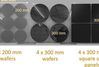 La simulation de coût effectuée a montré un avantage significatif du traitement de quatre tranches rondes de 300 mm assemblées sur le panneau grand format. Cependant, l’utilisation de la surface obtenue en utilisant quatre sous-panneaux carrés de 300 mm assemblés sur le panneau de verre conduit à des gains potentiels supplémentaires importants.