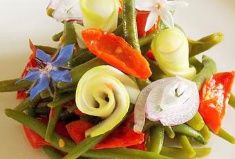 Aujourd'hui, je vous propose une Salade de haricots verts, tomates confites et chou-rave (Vegan) :