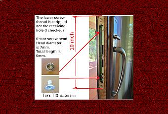 Parmi ces portes, celle que nous utilisons le plus s'ouvre de la cuisine sur notre terrasse extérieure. Un jour, ma femme a trouvé une toute, toute petite vis égarée sur le sol et qui provenait de la serrure de cette porte. J'ai essayé de la remettre en place, mais son filetage était endommagé.