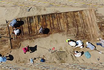 Mais après sa mise au jour, le grand danger était le soleil éclatant, qui menaçait d'assécher le navire trop rapidement; aussi, un archéologue aspergeait les restes d'eau pendant que d'autres déterraient l'épave.