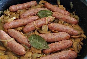 Lorsque l’oignon et les champignons prennent une couleur dorée, ajoutez les saucisses fraîches et faites-les revenir de tous les côtés jusqu’à ce qu’elles soient légèrement dorées.