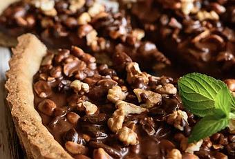 2 Pendant ce temps , hachez grossièrement les noix et faites-les revenir dans une poêle anti-adhésive avec 30 g de sucre en poudre afin qu’elles caramélisent légèrement. Laissez-les refroidir et répartissez-les sur le fond de tarte. Faites fondre au bain marie le chocolat et ajoutez la crème. Mélangez à l’aide d’une cuillère en bois puis versez cette crème sur la tarte. Laissez refroidir et réservez au réfrigérateur durant au moins 1h avant de servir.