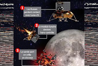 Connaissant Vladimir Poutine, je ne pense pas qu'il était content d’apprendre que sa sonde spatiale Luna-25 s’était écrasée au lieu de se poser en douceur sur la lune après que les communications aient été interrompues, selon ce qu’a rapporté l’agence de presse TASS, relayant le communiqué de l'administration spatiale russe Roscosmos.