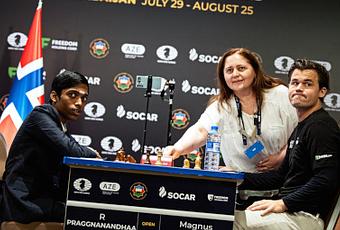 Aynur Sofiyeva, première femme grand maître d'Azerbaïdjan et vice-présidente du Comité d'État pour les affaires de la famille, des femmes et des enfants, a fait le premier coup cérémoniel dans le match entre Magnus Carlsen et Praggnanandhaa - Photo © Stev Bonhage