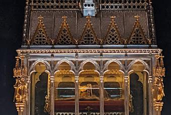 Étienne fut roi de Hongrie de 1000 à 1038. Il fut canonisé en 1083 par le pape Grégoire VII. Lorsque sa dépouille fut exhumée de son tombeau située dans la crypte de la basilique de Szekesfehervar, on découvrit que le bras droit était intact. Il fut alors placé dans une reliquaire et exposé à la vénération populaire. La relique fut ensuite coupée en deux. Le haut du bras partit en Ukraine et la main fut emportée en Croatie au 13ème siècle pour être protégée des invasions barbares. L'impératrice Marie-Thérèse la fit transporter au château de Schönbrunn à Vienne. Elle fut ensuite être envoyée au château de Buda en 1771. Lors de la Seconde Guerre mondiale, la main droite fut à nouveau rapportée en Autriche à des fins de protection, où elle fut cachée dans une grotte par l’évêque de Salzbourg. Enfin, le 20 août 1945, un prêtre servant dans l’armée américaine rapporta la main en Hongrie.