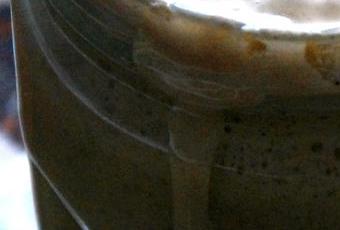 Au cinquième jour, mon levain avait beaucoup moussé, alors je l'ai partagé en deux comme elle le mentionnait Coc la cairote,(partager le levain en deux permet de diminuer l'acidité de ce dernier) j'ai continué de nourrir une partie que j'ai utilisé deux jours après pour faire mon premier pain et l'autre partie je l'ai placé dans un bocal en verre au réfrigérateur.