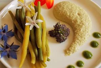 Aujourd'hui, je vous propose des Haricots, du houmous au concombre et une huile orties-bourrache-dahlia (Vegan) :