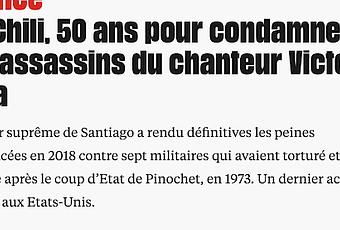 Un long marathon judiciaire a pris fin lundi 28 août au Chili, avec la confirmation par la Cour suprême des condamnations prononcées en 2018 à l’encontre de sept anciens soldats jugés coupables de l’assassinat, en 1973, du chanteur Victor Jara, au lendemain du coup d’Etat militaire du général Pinochet. Ces militaires à la retraite, aujourd’hui âgés de 73 ans à 85 ans, purgeront des peines de huit à vingt-cinq années de détention. Libres jusqu’à présent, ils devront entrer en prison. Trois autres accusés sont morts avant la fin de la procédure, et le dernier, réfugié aux Etats-Unis, est suspendu à une demande d’extradition.